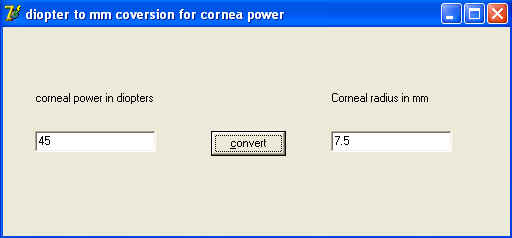 This program converts back and forth from corneal power in doptres to corneal radius in mm. Very useful for IOL power calculations and Contact lens practice Free for individual use. No nag screens. No registration required. This file is approx 400 Kb in size and will download in les than 1 min over a 128 Kbps cable connection |