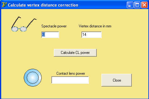 This little program calculates the Contact lens power required for various spectacle powers and vertex distances. Useful for contact lens practitioners. Free for individual use. No nag screens. No registration required. This file is approximately 0.5 MB in size and will take approximately 1 minute to download over a 128 Kbps cable connection |
